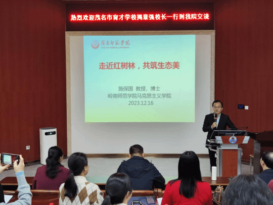 12月16日,茂名市育才学校校长揭章强带领骨干教师一行19人到我校马克思主义学院研修,听取广东省红树林生态文明建设科普基地负责人施保国教授的讲座《走近红树林,共筑生态美》,深入学习习近平生态文明思想,研究大中小学一体化推进生态文明教育。马克思主义学院党总支书记邓倩文、院长夏松涛和部分教研室主任参加研讨。