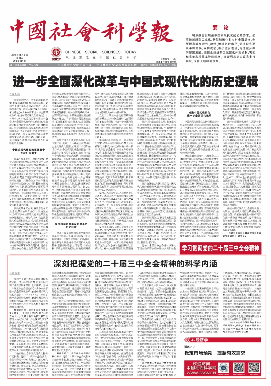 8月6日,《中国社会科学报》头版刊发我校马克思主义学院副院长施保国教授理论文章《深刻把握党的二十届三中全会精神的科学内涵》,展现我校学习宣传贯彻党的二十届三中全会精神的理论成果。