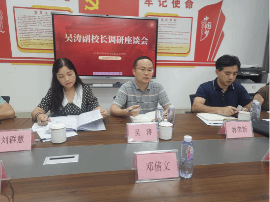 吴涛听取了学院的人才引进和科研工作汇报,针对存在的问题和困难给出了具体的指导意见,鼓励学院主动与有关职能部门对接沟通,勇于改革创新推进人才引进,对标对表全力以赴做好硕士学位点培育建设工作。刘群慧、林荣新分别对马院硕士学位点培育建设工作和人才引进工作作了指导。