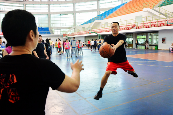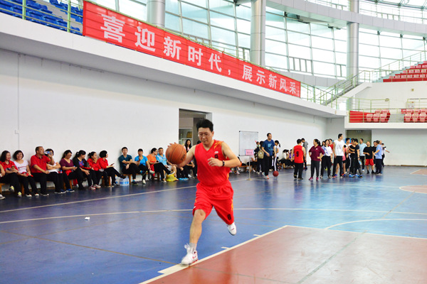 “好球!漂亮!”摸石头过河结束后,运球投篮项目也衔接开展。本项目共有18支参赛队伍,每队6人进行运球接力。男选手们自信矫捷地三步上篮,动作一气呵成;“女将”们巾帼不让须眉,带球上篮同样得心应手。据机关二代表队的女选手赵亚丽表示很满意今天“一次过”的佳绩,她说这是平时坚持练习的回报。18支参赛队伍分4组同时进行比拼,多数队伍都在90秒内完成6个来回的交接。最后,图书馆代表队突破1分钟大关,以57″36的总成绩夺得第一名,马克思学院、体科院分列二、三名。