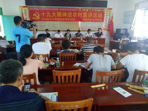 为了推进党的十九大精神进基层、进农村,帮助广大农村党员干部群众深入学习和领会党的十九大精神,近日上午,马克思主义学院毛泽东思想和中国特色社会主义理论体系概论课党支部(下简称“概论课党支部”)全体党员赴麻章赤岭村开展《党的十九大精神进农村》主题宣讲活动,这也是“概论课党支部”开展的一次具有深刻意义的党日活动。此次活动得到赤岭村委会党支部高度重视和支持,并精心组织了全村党员同志以及部分村民参加了宣讲会。