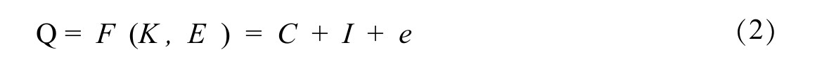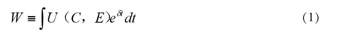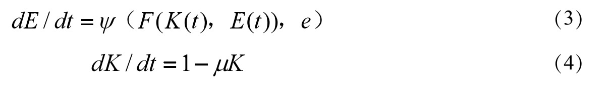 其中是时间偏好率,衡量未来几年的效用比当前的效用的贬值程度,C是消费,E是环境质量。给定E(t),则代表个人的效用最大化受资源约束,如等式(2)所示,产出是资本K和环境E函数F ():