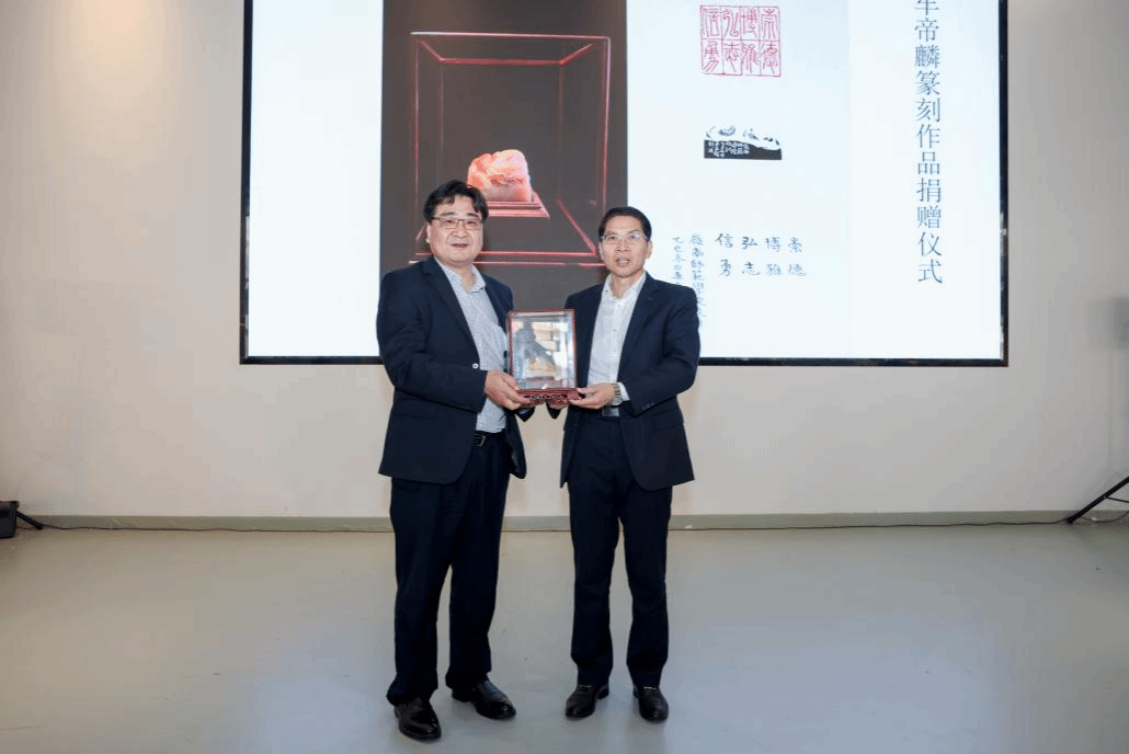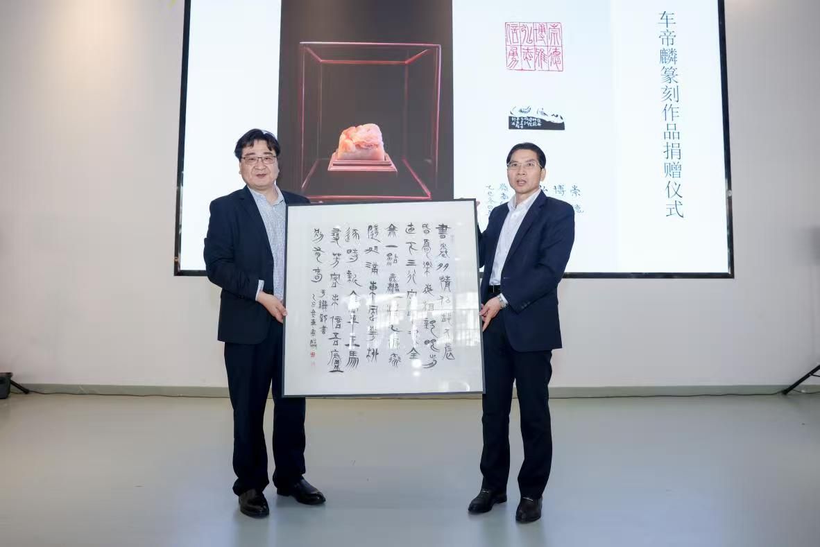 岭南师范学院党委副书记林晓敏代表学校、学院接受车帝麟的书法篆刻捐赠作品(车帝麟、美院书法系学子供图)