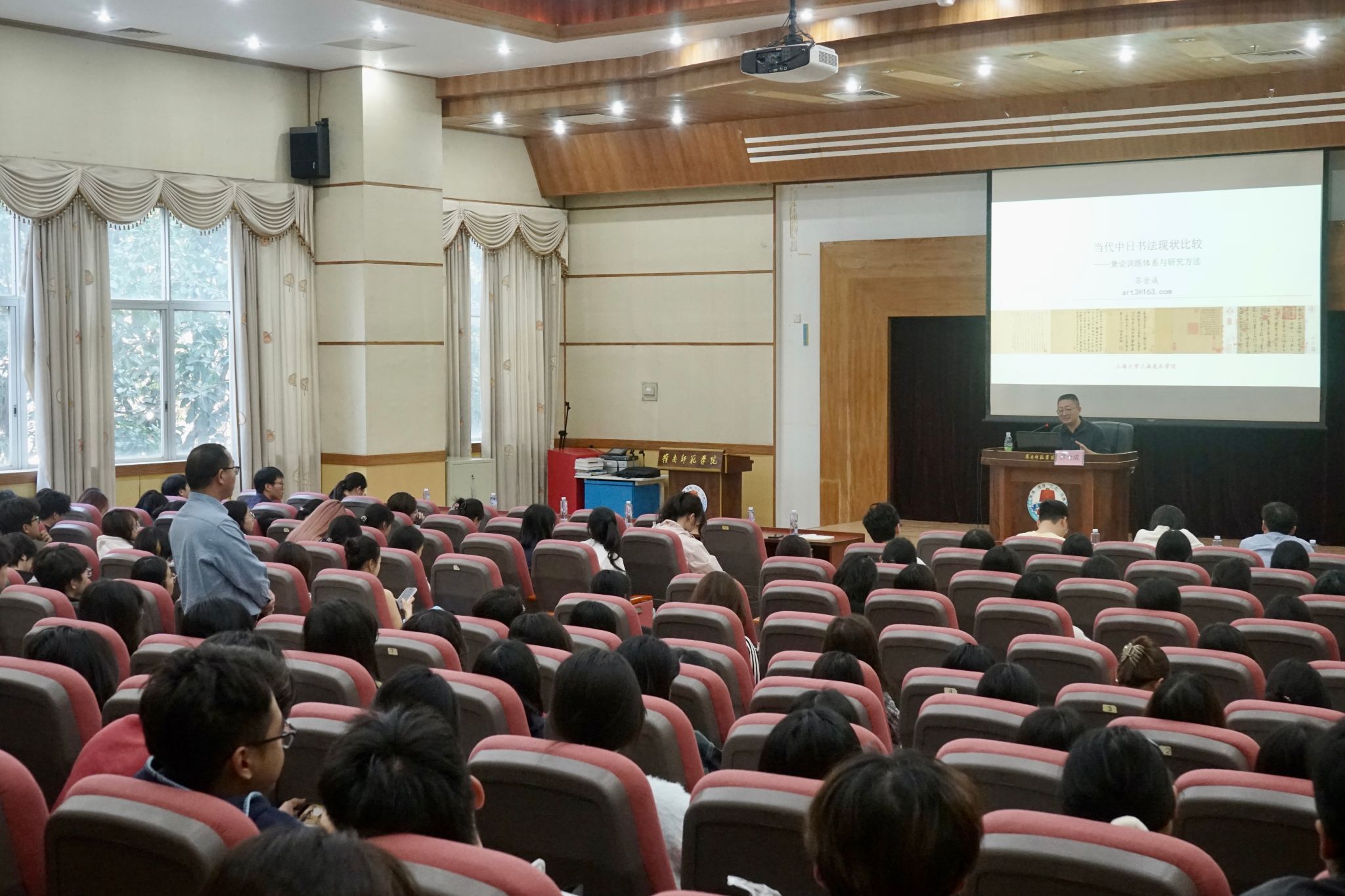 2025年11月25日,美术与设计学院在图书馆学术报告厅成功举办雷阳大讲坛。本次讲座特邀上海大学上海美术学院教授、博士生导师苏金成担任主讲嘉宾,学院院长乔志强主持报告会。讲座以“当代中日书法现状比较——兼论训练体系与研究方法”为主题,吸引了学院师生及校外艺术爱好者200余人参加。