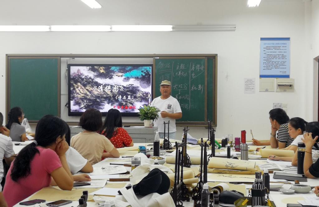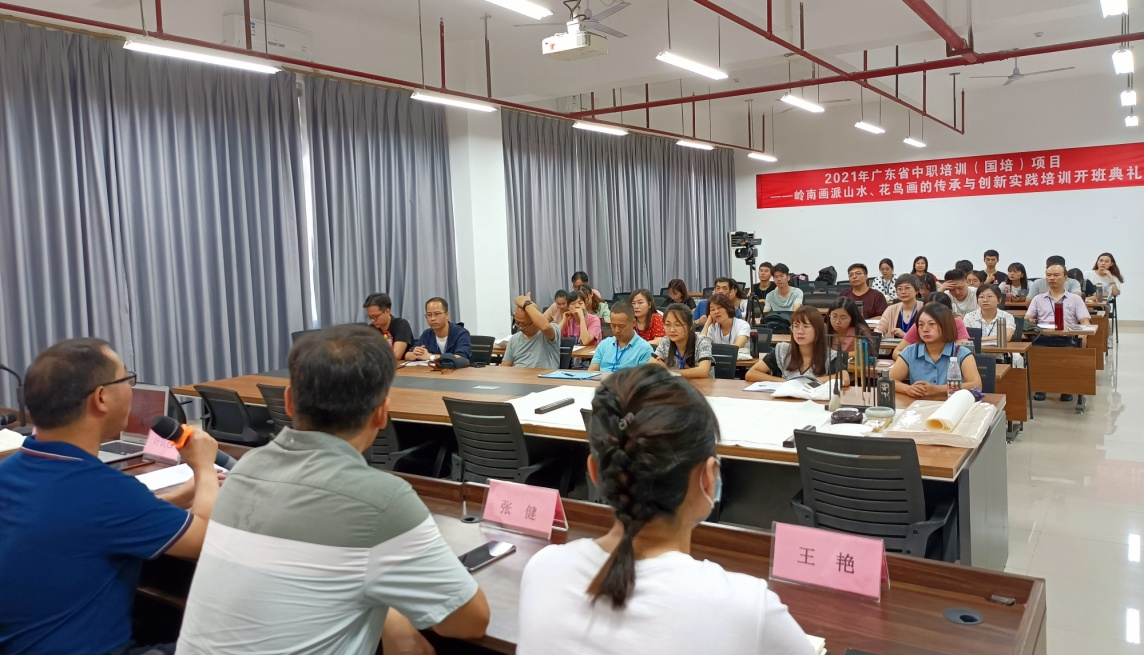 7月14日开班当天,美术与设计学院党委书记关天冲主持开班仪式,院长乔志强教授致欢迎辞,表达了对所有学员的欢迎和办好培训班的重视。岭南画派是岭南文化极具特色的优秀传统文化之一,其倡导的“折衷中外,融合古今,崇尚时代、弘扬创新”的精神,表现在山水画、花鸟画中尤为突出。学院承办的广东省高等职业院校教师培训国培项目《岭南画派山水画、花鸟画的传承与创新实践培训》,旨在服务地方基础教育推进“强师工程”和提升“双师型”教师专业技能,推进新时代学校美育工作。