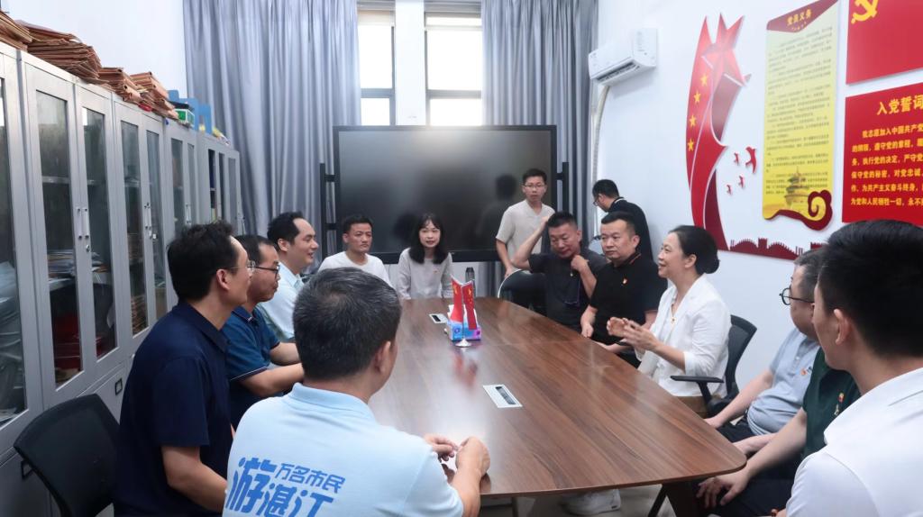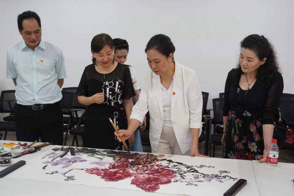 美术学院党委书记关天冲与广东画院林蓝等党员画家在学院党员活动室交流党建工作 (黄志杰 摄)