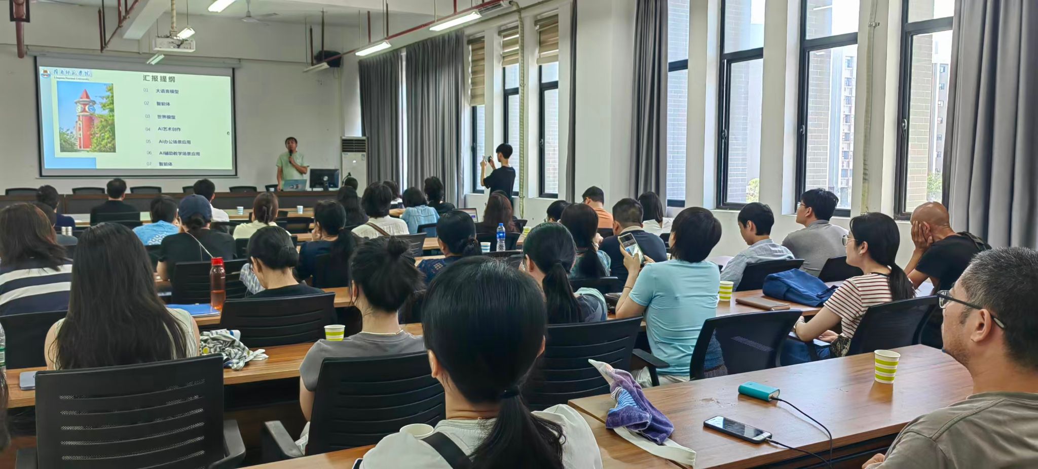 曾绍庚老师具体讲解了大语言模型、智能体、世界模型、AI艺术创作、AI办公场景应用、AI辅助教学场景应用、本地部署与私有知识库、AI未来等八大核心模块:详解DeepSeek大语言模型的技术成本优势、迭代路径及湛江借其创始人梁文锋技术推动发展的建议;介绍智能体AGI分级路线与Manus、Genspark等主流产品,Genie3、Marble等世界模型的3D场景生成能力;演示纳米AI、豆包AI等工具在AI艺术创作中的图生视频/生图、3D IP设计应用;覆盖AI办公全流程赋能,含DeepSeek R1提示词技巧、简历筛选、财务处理、PPT生成等;深入AI辅助教学场景,如3D数字人微课、岭师AI课堂的学情分析与智能批改,及课前到课后全环节支持;讲解Ollama、Dify等本地部署方案与私有知识库的隐私保护、减少幻觉等优势,为教育教学与办公实践提供技术支撑。