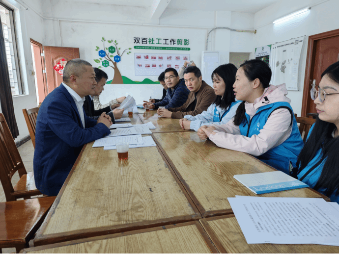 调研组第二站是石角镇振兴社区双百社工站。参与座谈的有本地一家从事精神健康社会工作服务的社工机构-风向标社会工作服务中心。座谈获悉,当地的精神健康社会工作服务项目服务群体人数多,3名社工要完成对891名服务对象的建档、探访、宣传教育等工作,工作任务极其繁重,只能从事一些基本服务,没有精力开展专业服务。