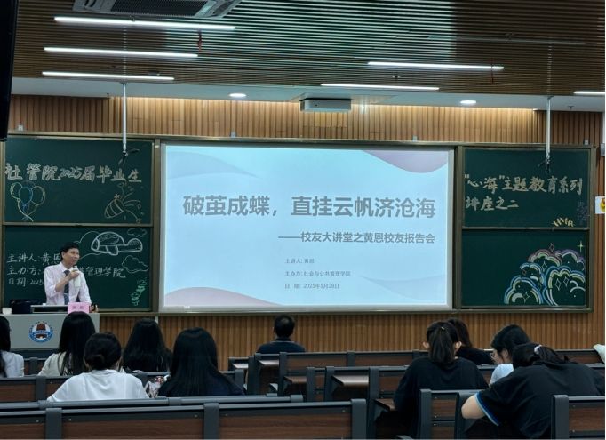 近日,社会与公共管理学院在第五教学大楼A栋104室成功举办校友大讲堂,我校1984届黄恩校友受邀作为主讲嘉宾参加了本次校友大讲堂活动。黄恩校友以“破茧成蝶,直挂云帆济沧海”为主题,深入分析了就业形势与政策,并分析如何树立正确就业观。