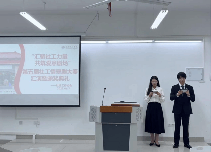 为深化同学们对社会工作专业的认知,弘扬社会工作专业价值观,传授社工工作的技巧与方法,社会工作协会于2025年6月7日19:30-21:00在社工实验室举办了“第五届社会工作情景剧大赛汇演暨颁奖典礼”。出席本次活动的嘉宾有胡林琦、胡志利两位评委老师,校干马华勇,院干孙德勤,社会工作协会会员和参赛同学。