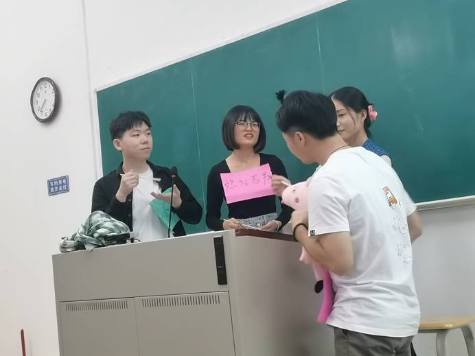 课堂点评:1.视屏剪辑的应用、故事中缓解冲突的“表情包”应用等,整体的创新性高、多元化;2.选材新颖,贴合实际,能把社工助人自助中“自助”的理论融入到股市里面,把它体现出来;3.道具准备也很到位,演员演绎出彩。