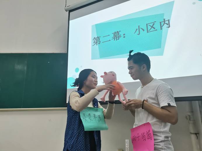 课堂点评:1,运用了许多社工常用的技巧与方法、专业元素突出;2.场景设计真实,表演流畅;3.在社区行动受限的情况下,能够采用多方力量,施加压力、进行问题解决,设计巧妙。