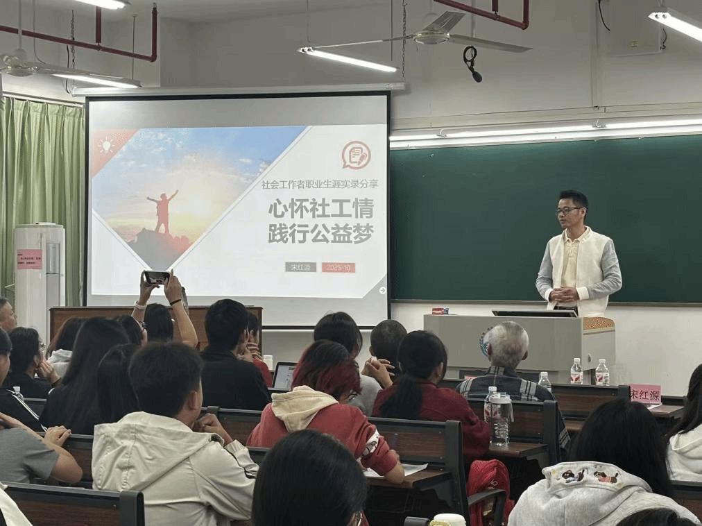 近日,社管学院于第五教学楼B511室成功举办校友大讲堂之宋红源校友报告会。本次活动特别邀请优秀校友宋红源返校,为师生传经送宝、分享经验。学院副院长黄剑教授、社会工作系全体教师及2025级社会工作新生共同参加本场活动。