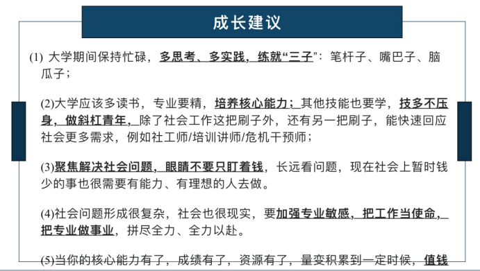 对于社工这个专业,宋红源校友提到,我们要懂得探索自己的内心:为什么我们要坚持在社工这条路上走下去?支持我们走下去的力量是什么?社工是一份完美的工作且拥有选择的自由,而追求自由就是追求幸福!做社工,要学精学专,更要不忘初心。随着社会的发展,社会对社工专业人才的需求量在扩大,社工职位逐步细化,形式类型多样化,新时代的大学生作为社会主义现代化的一代,更要对自己的工作报以激情,为实现强国目标贡献出力。