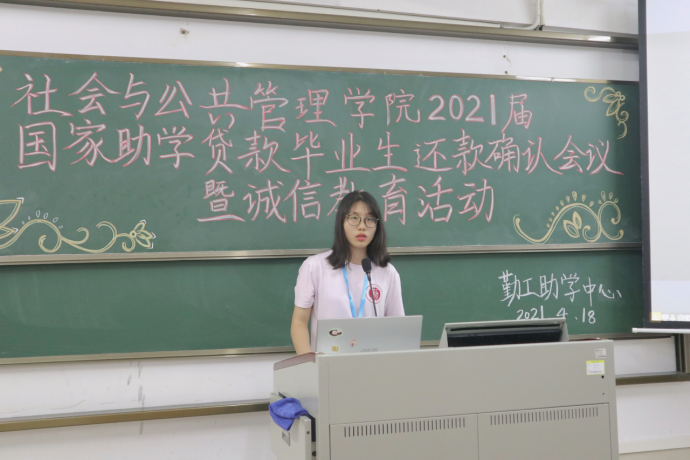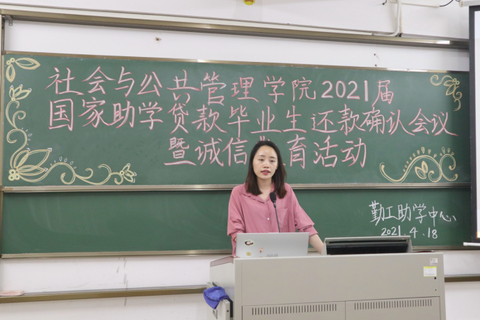 为确保贷款生还款工作顺利进行,提醒各位贷款毕业生诚信还款,4月18日晚,社管学院于弘雷楼803室采用“线上和线下”相结合的方式召开2021届国家助学贷款毕业生还款确认会议暨诚信教育活动,出席本次会议的嘉宾有勤工助学中心指导老师吴桂碧、校自强干部崔志桐同学、勤工助学中心负责人黄万霞同学以及2021届贷款毕业生。