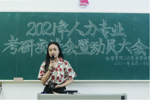 在大会上,来自社会工作专业的曾祎、人力资源管理专业的唐瑞、行政管理专业的邱思敏和陈静茹等四位考研成功的师姐与同学们分享考研经验。曾祎主要从择校、心态调整等方面分享了自身的经验;唐瑞主要从目标确立、备考学习、注意事项三个方面展开,鼓励同学们确立目标、做好规划,并分享“分散式”学习与做思维导图、框架表格图两种方法。而邱思敏和陈静茹则从考研计划制定、心态调整、复习技巧等方面与同学们进行分享。