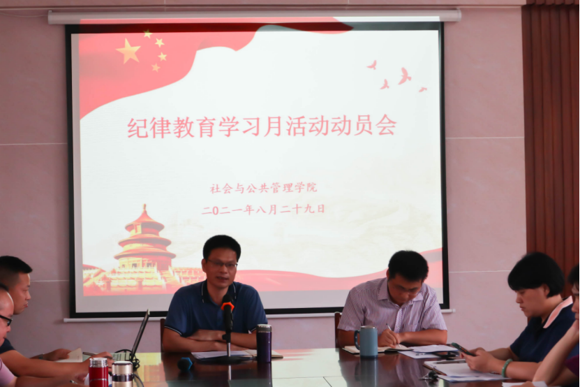 为扎实推进纪律教育学习月活动,贯彻落实学校纪律教育学习月活动要求,加强社管学院师生党风廉政建设,8月29日下午,社会与公共管理学院于弘雷楼大会议室召开纪律教育月活动动员会。会议由学院党委书记冯亮如主持,学院全体教职工出席本次会议。