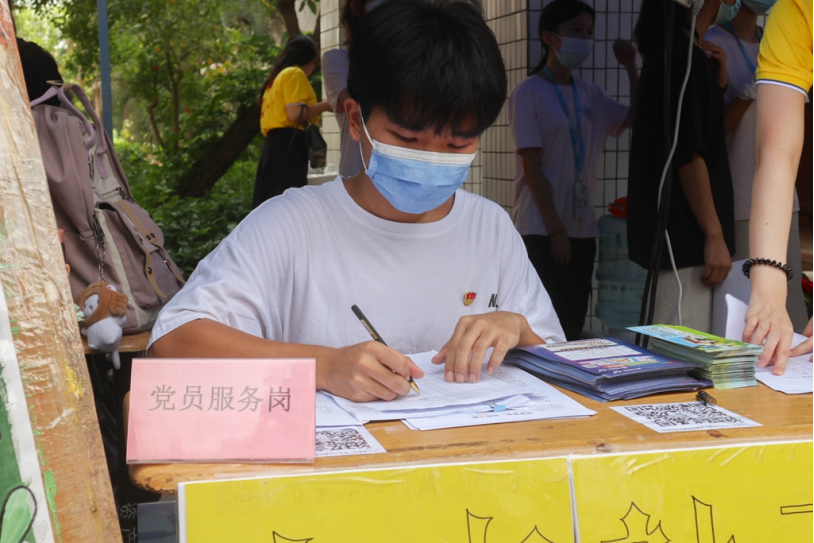 学生党员坚守党员服务岗协助新生完成签到工作,发放宿舍钥匙、空调遥控器、校园卡等物品。党员服务岗值班党员干部希望新生们能够在大学里培养兴趣,学有所成。党员黄嘉伟表示,希望师弟师妹们热爱学校,热爱自己的专业,愿大家珍惜在大学四年的时光,积极锻炼自我,成为社管学院的骄傲。