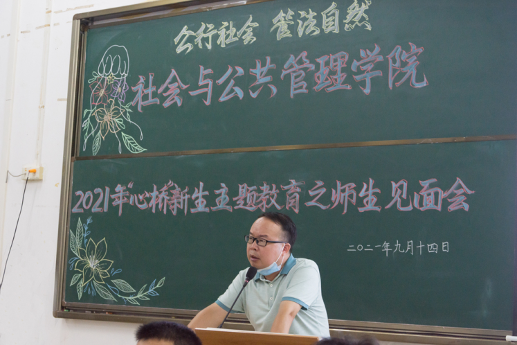 “因为有了你们的加入,我们这个年轻的社管学院更加充满了活力。”张勇代表社管学院对新生表示热烈欢迎。他分别介绍了学院行政管理专业、社会工作专业和人力资源管理专业的发展历程、专业特色等基本情况,并以六个关键词勉励学院2021级新生:一是“情怀”。习近平总书记说,大学是立德树人、培养人才的地方,是青年人学习知识、增长才干、放飞梦想的地方。作为社管学子,应厚植家国情怀,完善人格、健全体魄、学有所成,不忘初心、激发责任、报效国家。二是“有爱”。教育的本质是“一棵树摇动另一棵树,一朵云推动另一朵云,一个灵魂唤醒另一个灵魂”。教师需要用爱去教,学生应该饱含着爱去学,我们需要点燃爱、传递爱、享受爱。三是“责任”。养成现代公共意识,是实现“人的全面发展”的必然要求,是社会进步的重要标志,也是学习的动力与目的。希望同学们养成遵守公共规范、维护公共利益、爱护公共环境、热衷公共参与的现代公共意识,告别各种不良的生活行为。四是“学习”。要让刻苦学习成为青春的主旋律,让勤奋拼搏成为时代的正能量;要求得真学问,练就真本领,勇担新时代的使命和责任。只有静下心、坐得住,才能想得深、学得透,在自己的领域上不断深入耕耘,最终将成就求学和人生道路上的厚积薄发。五是“微笑”。人生总会遇到不可遇期的挑战,应当以微笑勇于战胜困难与挫折,以微笑面对人生。六是“敬畏”。希望同学们在内心深处,树立对专业知识的敬畏之心,因为专业知识才是我们的立足之本。我们“不唯书、不唯上,不唯师”,但也不能“无知者无畏”。同时,我们要敬畏生命,要对自然保持高度的敬畏之心。