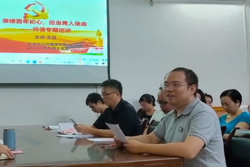 9月15日,社管学院于弘雷楼302室开展 “赓续百年初心,担当育人使命”师德巡讲活动。社管学院领导班子及全体教职工出席活动,活动由张勇副院长(主持行政全面工作)主持,学校第七届师德先进个人王征老师做师德专题巡讲。