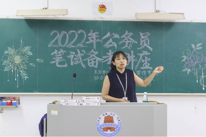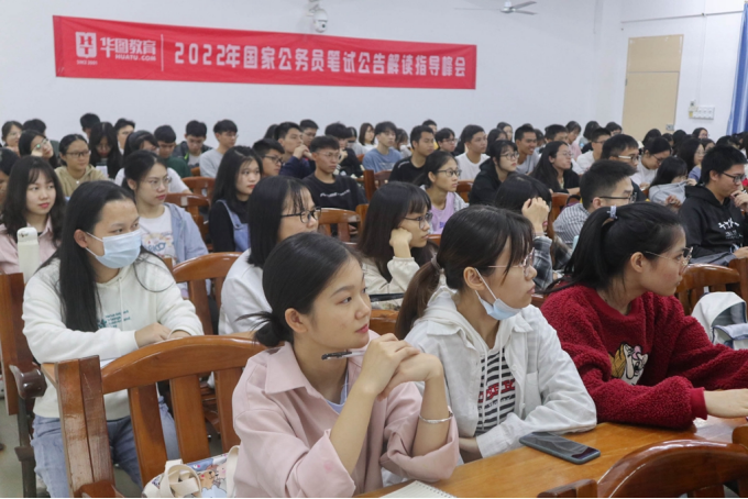 为让学生了解考试形势和快速掌握重要知识点,印雪围绕自身经历和案例,向在座同学从三方面进行讲解并提出建议:一、结合广东近三年公考考情考务,以国考大数据为支撑,她提议同学们应注意招考时间、考务区别和考试内容等信息;二、深入阐述2022年国考公告和解读备考指南,围绕“报考条件、突出分级分类、面试环节专业测试、明确调剂的方案细节、政治素养能力”五个方面重点展开讲解,她指出同学们应该注意自己是否满足报考条件,珍惜应届生的身份;三、以五个数量关系的例子入手,强调学好数资,着重建议同学们在做试题时,不仅要追求做对,还要追求做透。