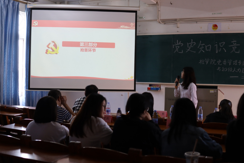 学党史,强信念,跟党走。为进一步激发师生学习党史的热情,加强对党史的了解,10月23日下午,社管学院管理专业教工党支部联合20级人力团支部于教三702举办了党史知识竞赛活动。
