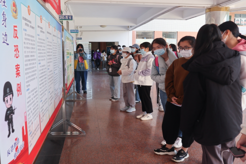 在参观普法展板过程中,湛江市公安局赤坎分局副局长袁志彪向大家介绍了《中华人民共和国反恐怖主义法》相关内容,围绕“恐怖主义的定义”“恐怖主义的一系列活动”“公民、组织的权利与义务”三个方面展开讲解,他以身边的反恐案例号召广大师生积极参与反恐宣传与教育活动,进一步增强“知恐、识恐、防控、反恐”等意识,明确自己作为一个中国公民的责任与义务。