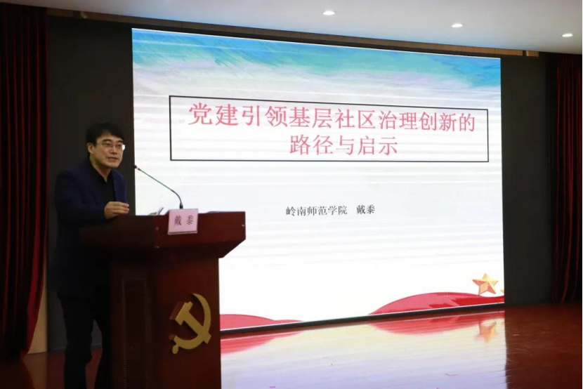 仪式结束后,岭南师范学院副校长戴黍教授作题为《党建引领基层社区治理创新的路径与启示》的专题讲座。戴校长系统阐释了社区治理主要理论,运用理论对社区治理中的难点与热点问题进行深入剖析,基于社区治理的现实与需求对社区治理创提出具体对策建议。讲座深入浅出,既关照了理论前沿,又回应了现实需求;既解答了从事基层治理领导干部和社区工作者工作中很多困惑,也给出了今后工作方法指引和路径建议。