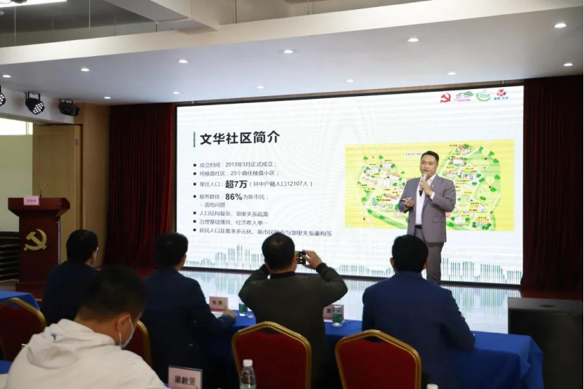 文华社区党委书记、居委会主任龙加燊详细介绍文华社区概况及“多元参与,协同共治”的社区治理实践,从党建引领“六员联动”的网格化管理到新市民融合服务机制的创新,重点阐述了文华社区治理创新的过程与特色。
