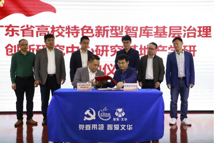2021年12月17日下午,岭南师范学院与顺德区龙江镇文华社区居委会在文华社区党群服务中心举行产学研合作协议签署暨广东省普通高校新型智库——基层治理创新研究中心研究基地揭牌仪式。参加仪式的有我校副校长戴黍教授、社会与公共管理学院副院长张勇教授、副院长黄剑教授及社工系主任谢正富副教授、龙江镇副镇长刘颢然、龙江镇教育线党委书记张峰、龙江镇综治办副主任钟新森、龙江镇文华社区党委书记龙加燊以及社区“两委”班子成员等。