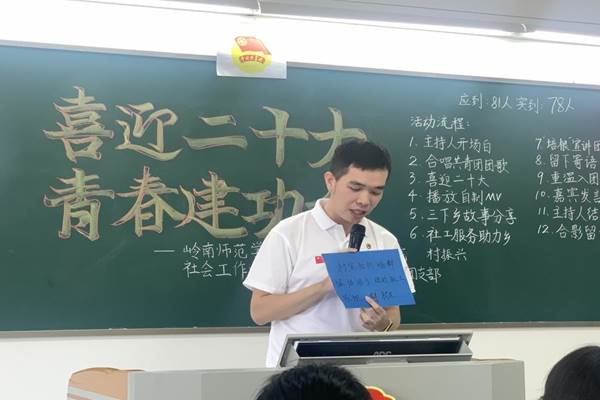 叶振豪和高远结合社工专业知识,阐述了乡村振兴对社工专业学子的重要性,加深了同学们对乡村振兴战略重要性和必要性的认识。同学们纷纷表示,作为新时代的青年大学生,我们要将专业学习与服务社会充分结合起来,积极参与到乡村振兴工作中去,以实际行动迎接党的二十大胜利召开。