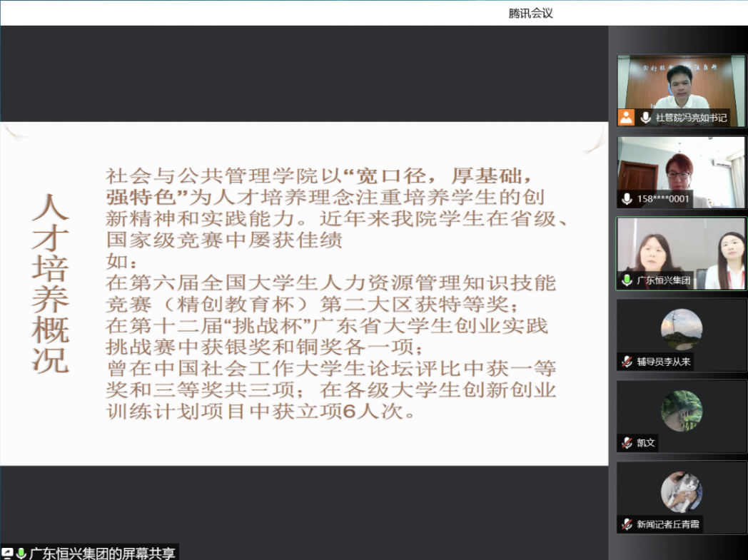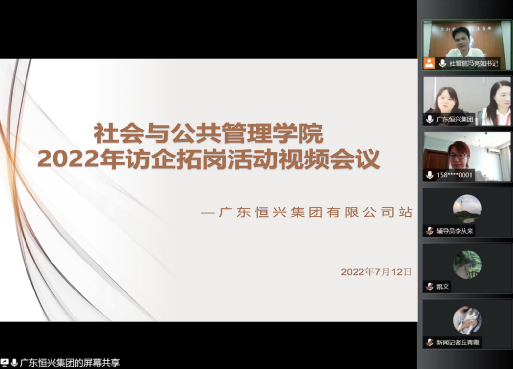 为深入贯彻落实党中央、国务院关于“稳就业、促就业”决策部署,进一步强化校企衔接,深化校企合作,促进毕业生的更高质量就业,7月12日上午,社管学院与恒兴集团企业代表在线上开展访企拓岗会议。学院党委书记冯亮如、副院长徐凯赟、人力资源管理系主任马诗咏及学工办辅导员李从来,恒兴集团人力资源总监金磊及招聘经理林华英出席会议。会议由马诗咏主任主持。