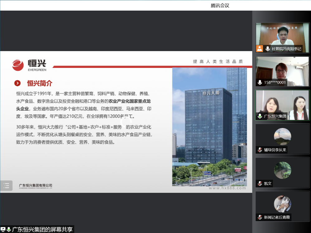 冯亮如书记向恒兴集团参会人员介绍了社管学院的基本情况及人才培养概况。人才培养离不开社会的关注及企业的支持,冯亮如书记指出将在“教、学、研究”三个方面加强与企业的联系,不断深化改革我院的人才培养模式。面对疫情影响、就业困难的形势,冯亮如书记希望与恒兴集团进行深度合作,深入了解企业对人才培养的需求和愿望,并据此不断地改善我院的人才培养模式,为企业提供更多的优秀毕业生,争取学院与企业双向共赢。