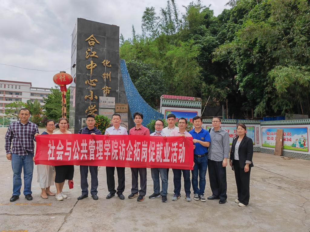 为有效汇聚社会有效资源,拓展优质就业岗位,提升学院人才培养质量,社管学院积极响应和推进访企拓岗促就业专项行动,深化单位之间合作,拓宽教育交流领域。4月22日,社管学院院长张勇,副院长黄剑、正处级辅导员钟明杰、社工系主任谢正富、行管系主任沈洪涛等一行实地专访化州市合江镇中心小学开展访企拓岗促就业专项行动。