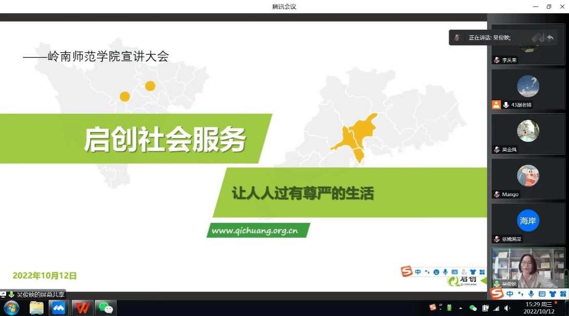 为切实做好我院毕业生就业工作,扩大我院学生实习实践就业渠道,大力构建学生与企业的交流平台,促进学生实习就业。10月12日,社管学院邀请中山市启创社工服务中心于线上开展了宣讲会。宣讲会由启创社工服务中心副总监吴俊映主讲。社管学院黄剑副院长、社工系主任谢正富,社工系专业教师代表、辅导员李从来及2023届全体社工专业学生参加了本次宣讲会。