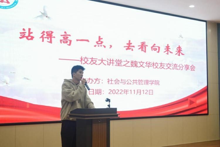 11月12日上午,社管学院在弘雷楼511室举办了“校友大讲堂”系列经验交流会。2022届公共事业管理专业毕业的优秀校友魏文华应邀以“站得高一点,去看向未来”为主题开展了交流会。社管学院党委邓蔚婵副书记、全体辅导员老师以及全体学生干部出席了本次活动。