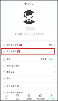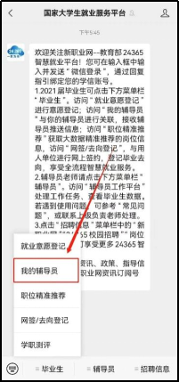 4.绑定成功后,自动回到个人中心,应届生首次登录须先登记就业意愿,选择后,在个人中心列表上点击“我的辅导员”