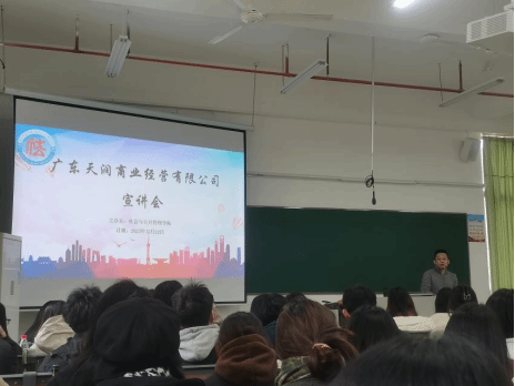 12月22日,广东天润商业经营有限公司应邀到我院开展专场宣讲会。公司行政人事总监詹峰担任本次宣讲会活动的主讲人,我院2021级人力资源管理专业全体学生参加了宣讲活动。活动由人力资源管理系教师王征主持。