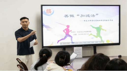 3月23日,社会与公共管理学院于第五教学楼D栋303室举办了校友大讲堂活动。2022届人力资源管理专业校友简炳炽受邀回到母校开展了以“善做加减法”为主题的讲座。活动由学工办副主任李从来老师主持。
