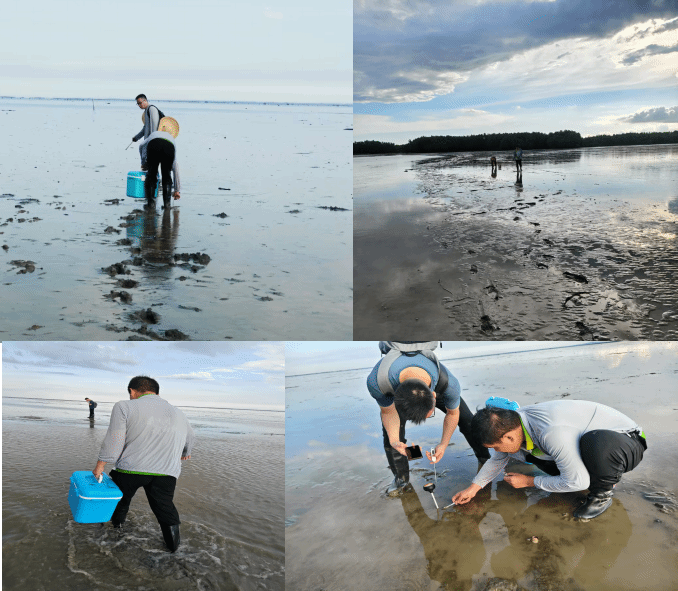 生科院教工第三党支部迅速行动起来,围绕中华鲎人工繁育项目,积极开展科研攻关和技术服务,为合作项目的顺利实施提供了有力支撑。袁吉贵博士作为该支部的优秀党员,以身作则,全身心投入到研究工作中。他率领调研小队,于7月26日奔赴雷州市北家村中华鲎原生滩涂开展实地调查,深入了解中华鲎在自然环境中的生长和繁殖习性。8月5日,赴博康公司中华鲎人工繁育基地开展调查活动,重点研究中华鲎在养殖池塘中自然产卵和受精的“疑难杂症”,为技术升级提供了宝贵的第一手资料。