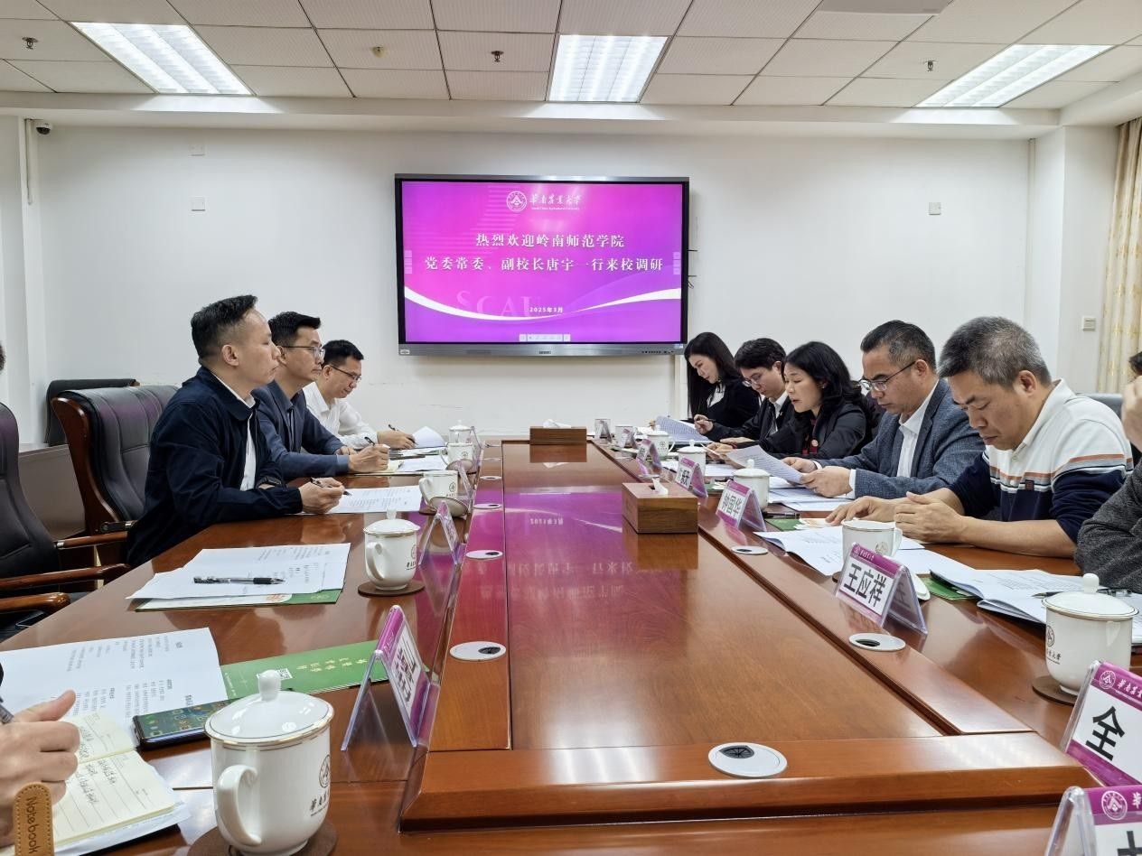 在华南农业大学,党委常委、副校长陈乐天热情接待唐宇一行。陈乐天代表学校对唐宇一行来访表示欢迎,并简要介绍了该校整体发展情况。他表示,希望通过此次交流,加深两校的互动与合作,共同推进高等教育事业发展。唐宇对华南农业大学的接待表示感谢,并简要介绍了岭南师范学院的发展概况。他表示,希望以此次交流为契机,推动双方在学科建设、科学研究、校地合作、科研合作、大学生科技创新以及研究生联合培养等方面实现多方位合作。两校相关职能部门和学院负责人围绕学校发展战略规划、科学研究、学科建设、校地合作、科研合作以及研究生联合培养等方面进行了深入探讨。会前,唐宇一行还前往华南农业博物馆参观调研。