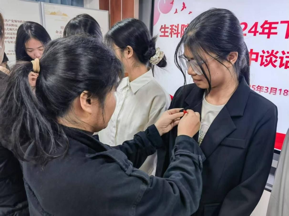 教师党员代表为新发展党员佩戴党员党徽