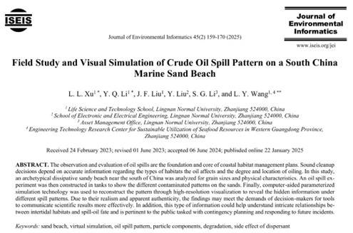 近日,生科院海洋环境研究团队王锂韫教授、许乐乐老师指导海洋资源开发技术专业本科生刘嘉峰同学在《Journal of Environmental Informatics》发表了题目为《Field Study and Visual Simulation of Crude Oil Spill Pattern on a South China Marine Sand Beach》的研究论文。