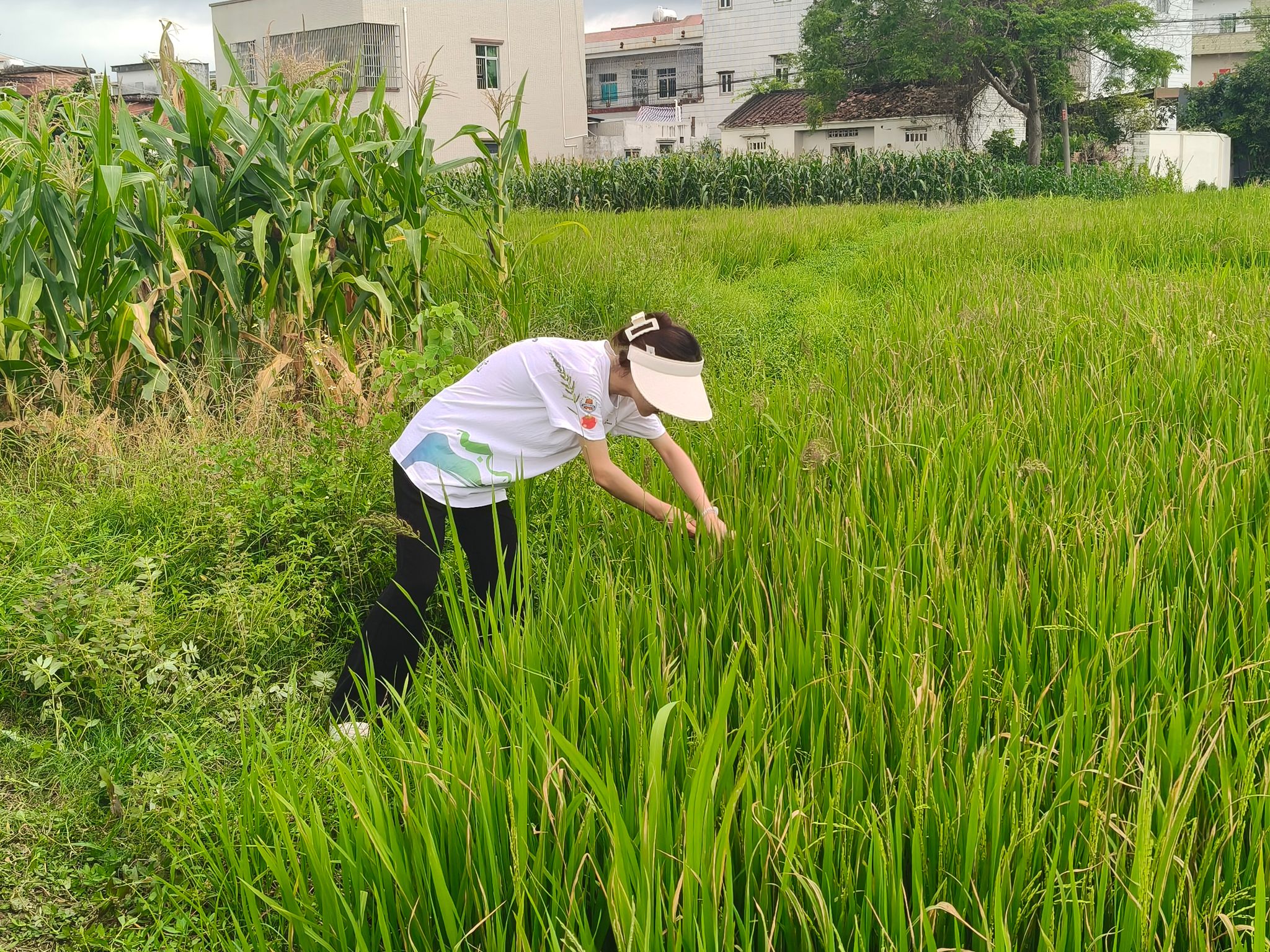 突击队队员在田间仔细采集带有典型病虫害症状的水稻叶片样本