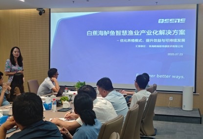 在珠海市斗门区“百千万工程”指挥部办公室副主任、岭南师范学院“双百行动”驻区服务队队长张洪军教授带领下,生科院调研组前往珠海欧森斯传感技术有限公司,参观其产品展示厅,深入了解了该公司的发展历程与主要业务,并听取了白蕉海鲈鱼智慧渔业产业化解决方案。双方就白蕉海鲈的智慧喂养、智慧分选和标准化分级等方面开展了深入合作交流,并初步达成合作意向。