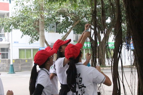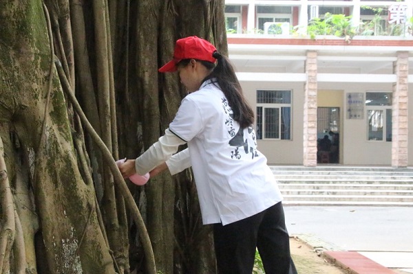为了此次活动,17生本一支部志愿者身着白色志愿服,头戴标志性红帽,提前来到了集合地点等候。他们兵分两路,分别在旧区和新区“照顾”高山榕并进行对高山榕的宣传。一路上,志愿者向往来的同学分发宣传单,用剪刀剪掉绑在高山榕树上的红丝带,并且对榕树下的环境进行了打扫。其中,对高山榕喷洒激素是活动的主要环节。志愿者手持小喷壶,细心地向高山榕的所有气生根喷洒激素。在志愿者的努力下,校园道路两边植被不再是枯荣满地,变得干净整洁了,而喷洒了激素的高山榕也得到了保护和促进生长。