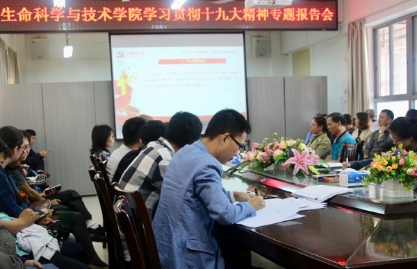 【生科院新闻中心11月30日讯】根据学校党委《关于学习宣传贯彻党的十九大精神的工作方案》要求和学校《关于做好党的十九大精神宣讲工作的通知》精神,11月30日下午,生命科学与技术学院于燕雷楼D505室召开学习贯彻党的十九大精神专题辅导报告会,并特别邀请党的十九大精神校内宣讲团成员、马克思主义学院洪小瑛副教授进行授课,宣讲党的十九大会议精神。会议由生科院党委袁长春书记主持。