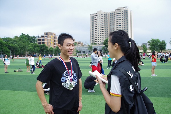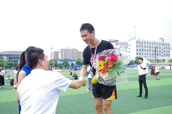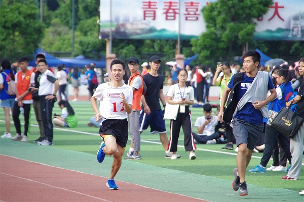 比赛一开始,选手们在跑道上挥洒汗水,心中秉着坚持的精神,全力以赴地向终点奔去。比赛愈发的激烈,紧张气氛也逐渐攀升,但是观众们仍然激情似火,为选手们加油打气。“生科生科,气势如歌,魅力飞扬,生科最强!”生科院的加油口号洋溢着整个田径场。