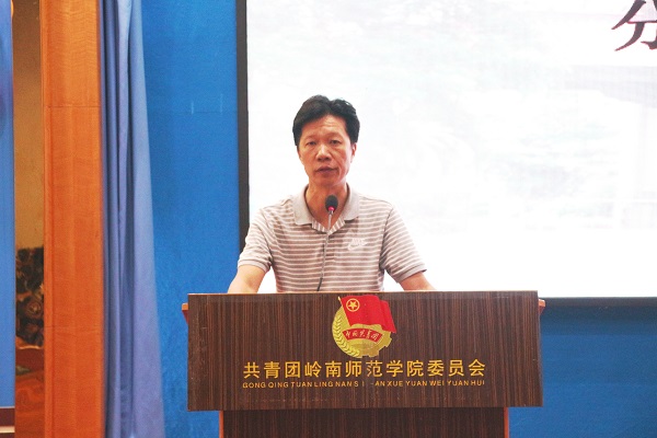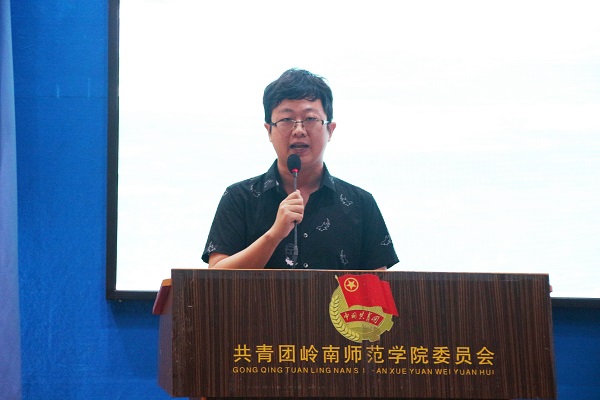 在热烈的掌声之下,生科院分校校长郑侯锦副书记上台发表讲话,郑书记以“读懂团歌,唱响团歌,做一个有为青年”开篇,从国家发展和时代责任两个方面阐述青年们学习党的十九大精神的重要性。接着,郑书记指出团学活动应通过“依托专业知识,紧扣时代脉络”的方式落实党的十九大精神,从而有效吸引青年们的关注。郑书记引用习近平主席的一句话鼓励同学们在学习的道路上要“不忘初心,开拓前进”,争做一个有为青年。最后,郑书记宣布共青团岭南师范学院委员会业余团校生命科学与技术学院分校正式成立。