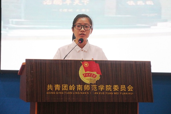 在观看完十九大相关视频之后,优秀团学干部黄怡上台发言,黄怡分享了自己在一年干部生活里的收获并寄语同学们在大学生活里要学会做人做事,学会求知与生活。而后,辅导员易铜老师以活动负责人的身份上台发言,易老师从成立分校的目的和意义两个方面鼓励同学们积极投身到社会主义事业的建设之中,并提出几点要求:学员们不仅要在行动与思想上入团,更要拥有经受住各项考验的坚强意志,同时要发挥团员的先锋模范作用,坚定正确的立场。